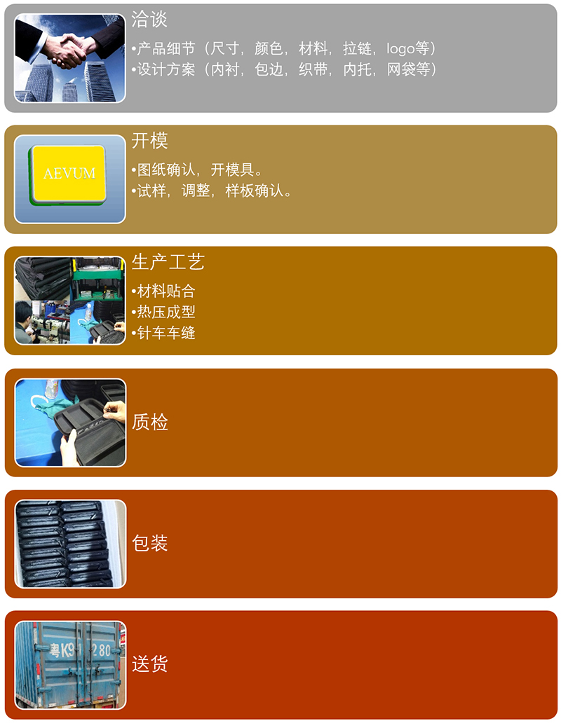誠遠箱包擁有自己的工廠,集模具開發、熱壓成型、針車工藝車間、倉儲于一體專業EVA包生產廠家。位于東莞沙田,始建于2001年,已有19年EVA包生產制造經驗,專業生產EVA包,遠銷歐美等國家。